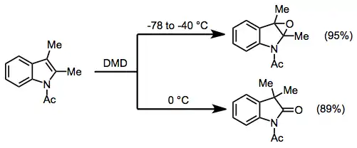 In oxidations of heteroaromatic compounds, the products obtained depend on reaction conditions. Thus, at low temperatures, acetylated indoles are simply epoxidized in high yield (unprotected indoles undergo N-oxidation). However, when the temperature is raised to 0 °C, rearranged products are obtained.[11]