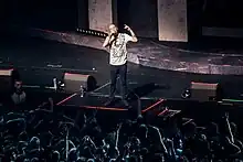In reaction to the 2022 Russian invasion of Ukraine, Oxxxymiron called for an anti-war movement, stating, "I know that most people in Russia are against this war, and I am confident that the more people would talk about their real attitude to it, the faster we can stop this horror." He cancelled six sold-out concerts in Moscow and St. Petersburg, stating, "I cannot entertain you when Russian missiles are falling on Ukraine. When residents of Kyiv are forced to hide in basements and in the metro, while people are dying."[12] He later said that it was impossible to hold an anti-war concert in Russia because "total censorship has been implemented, and anyone who speaks out against the war in any way becomes a potential target for criminal prosecution."[13] He went on to announce a series of benefit concerts in other countries, entitled "Russians Against War", the proceeds from which would be donated to NGOs helping Ukrainian refugees. The first of these concerts was held in Istanbul, which has a large Russian diaspora consisting of people who left the country in protest of the invasion.[14] In September, he returned to Russia; the next month, the Russian justice ministry added him to the list of foreign agents.[15]