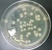 Right:Bacteria transformed with pGLO exposed to ampicillin, arabinose and ultraviolet light