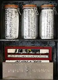 - ↑ Rob Perrée writes in 1988 in:[4]: 43 [...] ""HouseRites" is Pink's most complex project. Not because she combines the various disciplines of Environment, Video and Performance, since her other works are not in this sense simple either. It is more because her subject matter is clustered together into a compact whole and that, from the 'filled' source, she still links up the territorial character of the space in which the work presents itself - that is, the museum. The Environment consists of a large, dark-red marble ring, with a steel ring around that. From this steel ring, seven safes ascend. Six of them from the inside; the seventh is aimed, by means of a monitor, directly at the viewer. Behind the ring is located, on a wooden dais, a marble chimney. The totality is screened off from the viewer and the surroundings by a sisal cord. The Performance consists of Pink's careful morning cleanup of her territory. After that she dresses up in evening clothes, goes and gets the objects important for her and her family out of the safes, and places them with care and dedication on the mantelpiece, next to other personally tinted objects. Then she leaves the space and turns on the monitor, which lets her own, intimate light shine on the separate objects. At the end of the afternoon she stashes everything up securely in the safes. This daily ritual is repeated for three weeks. The "HouseRites" take place in a museum space or in its vicinity, but then 'wrapped up' in their own glass museum - the so-called Crystal Museum. By protecting and pampering them, and by giving luster to the objects to be emphasized, Pink refers to the curating function of a museum. By screening off her ordinary, quotidian rituals, she is at the same time taking distance from them, because curating at a museum is mainly aimed at lifting works of art out of the everyday. "