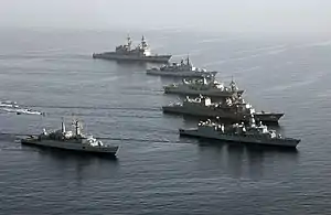 ![]() PNS Khaibar (DDG-183) (first vessel on bottom on the left) assemble in a formation led by the German frigate Augsburg participating in the Combined Task Force-150 in the Indian Ocean in 2004. | |