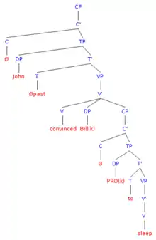 In generative linguistics, PRO (called "big PRO", distinct from pro, "small pro" or "little pro") is a pronominal determiner phrase (DP) without phonological content. As such, it is part of the set of empty categories. The null pronoun PRO is postulated in the subject position of non-finite clauses.[1] One property of PRO is that, when it occurs in a non-finite complement clause, it can be bound by the main clause subject ("subject control") or the main clause object ("object control"). The presence of PRO in non-finite clauses lacking overt subjects allows a principled solution for problems relating to binding theory.[1]