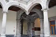 Like many other buildings in the historic downtown, the facade is covered in tezontle (a blood-red porous volcanic stone), with windows and doors framed with chiluca (a grayish-white stone), but the building has two main notable features. This first is that its main portal is located at the southwest corner, which is canted (cut off) in order to face Santo Domingo Plaza. Arrieta came up with the idea, an innovation in New Spain. With this design, not only would the building face the plaza, its two side streets would lead to its door. This feature would earn the palace the nickname of "flat-faced" (chata), and this idea was declared innovative and beautiful. The other feature is the patio. The arches on the four corners do not rest on columns, but seem to hang from the ceiling, similar to a vaulted ceiling. In fact, they are crossed arches that are supported by pillars attached to the walls and the first columns on each side.[1]