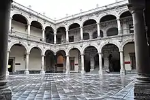 From nearly the beginning of the colonial period until the Mexican War of Independence, this spot has been the headquarters of the Inquisition in the colony of New Spain.[2][3] While the Tribunal of the Holy Inquisition was not fully established here until 1571, the first cleric with inquisitorial duties was Martin de Valencia, who came to the colony in 1524. The Dominicans, in whom the papacy had invested Inquisition duties, arrived in 1526 and proceeded to build a monastery in the area occupied by both the current palace and the Church of Santo Domingo. The first official Inquisitor for the colony, Pedro Moya de Contreras, worked in the section of the monastery, where the palace would be built in the 18th century.[2]