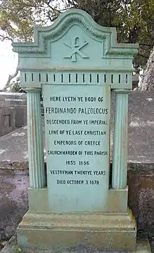Ferdinand died in 1670 and was survived only by his son, Theodore.[98] Theodore left Barbados to work as a privateer, serving aboard a ship called Charles II, and died at A Coruña, Spain in 1693.[99] Theodore had a son, who probably predeceased him,[100] and was survived only by a posthumous daughter, Godscall Paleologue, born in January 1694.[98] Nothing is known of Godscall's life, the only record of her existence being her baptismal records. She was the last recorded member of the family and, if their claim to descend from the imperial dynasty was true, the last true heir of the Palaiologan emperors.[3][4][8]