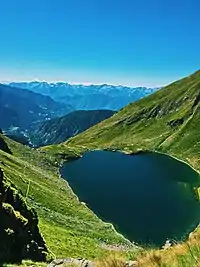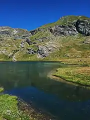 Situated at the bottom of a grassy hollow, enclosed by high rock walls, the lake is a deep basin of rather large dimensions. The latter is further accentuated by the steepness of the depression.[19]