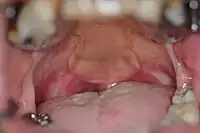 A palatal lift prosthesis is a prosthesis that addresses a condition referred to as palatopharyngeal incompetence. Palatopharyngeal incompetence broadly refers to a muscular inability to sufficiently close the port between the nasopharynx and oropharynx during speech and/or swallowing. An inability to adequately close the palatopharyngeal port during speech results in hypernasalance that, depending upon its severity, can render speakers difficult to understand or unintelligible.[1] The potential for compromised intelligibility secondary to hypernasalance is underscored when consideration is given to the fact that only three English language phonemes – /m/, /n/, and /ng/ – are pronounced with an open palatopharyngeal port.[2] Furthermore, an impaired ability to effect a closure of the palatopharyngeal port while swallowing can result in the nasopharyngeal regurgitation of liquid or solid boluses.