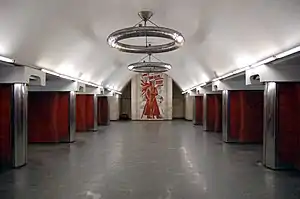 Palats Ukraina (Ukrainian: Палац Україна, ) is a station on ⓘKyiv Metro's Obolonsko–Teremkivska Line. The station was opened on 30 December 1984, and is named after Ukraine's biggest concert hall located near it. The architecture was designed by A.S. Krushynskyi, T.A. Tselikovska, N. Alyoskin, with other design by S. Kirichenko and R. Kirichenko.