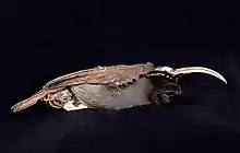 Pale-billed sicklebills are on the more medium-sized side of the family Paradisaeidae; they seldom reach over 35 cm, or 13.7 inches, in length. They are among the least attractive birds-of-paradise, being a dull brownish-olive on their upperside, with a greyish-brown underside. Their heads are dark brown, and one of their most noticeable features are lead-grey bare facial patches surrounding each eye and covering most of the head; there are also two iridescent tufts rising above the head. Unlike their congener's bill, they have a pale, ivory-ish colored, downcurved bill. The ornaments present on the male are relatively extensive pectoral feathers in rows on the sides of the breast and belly. The pectoral feathers highest on the breast (on each side) are dark greyish with coppery red to reddish iridescent tips; the rest of the pectoral plumes on the sides have more of a greenish-copper iridescence to their tips.