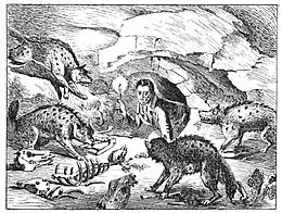 Cuvier went on to produce skeletal restorations of extinct mammals of his own. Some of these included restorations with musculature layered atop them, which in the early 1820s could be considered the earliest examples of illustrations of animal tissue built up over fossil skeletons. As huge and detailed fossil restorations were at this point appearing in the same publications as these modest attempts at soft tissue restoration, historians have speculated whether this reflected shame and lack of interest in paleoart as being too speculative to have scientific value at the time.[47] One notable deviation from the Cuvier-like approach is seen in a cartoon drawn by geologist William Conybeare in 1822. This cartoon depicts paleontologist William Buckland entering the famous British Kirkdale Cave, known for its Ice Age mammal remains, amidst a scene of fossil hyenas restored in the flesh in the ancient cave interior, the first known artwork depicting an extinct animal restored in a rendition of an ancient environment.[48] A similar step forward depicts a dragon-like animal meant to represent the pterosaur Dimorphodon flying over a coastline by George Howman; this 1829 watercolor painting was a fanciful piece that, albeit being not particularly scientific, was another very early attempt at restoring a fossil animal in a suitable habitat.[49]