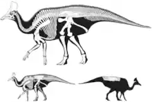 The role of art in disseminating paleontological knowledge took on a new salience as dinosaur illustration advanced alongside dinosaur paleontology in the mid-1800s. With only fragmentary fossil remains known at the time the term "dinosaur" was coined by Sir Richard Owen in 1841, the question of life appearance of dinosaurs captured the interest of scientist and public alike.[55] Because of the newness and the limitations of the fossil evidence available at the time, artists and scientists had no frame of reference to draw upon in understanding what dinosaurs looked like in life. For this reason, depictions of dinosaurs at the time were heavily based on living animals such as frogs, lizards, and kangaroos. One of the most famous examples, Iguanodon, was depicted as a resembling a huge iguana because the only known fossils of the dinosaur—the jaws and teeth—were thought to resemble those of the living lizard.[56] With Owen's help, Benjamin Waterhouse Hawkins created the first life-size sculptures depicting dinosaurs and other prehistoric animals as he thought they may have appeared; he is considered by some to be the first significant artist to apply his skills to the field of dinosaur paleontology.[57] Some of these models were initially created for the Great Exhibition of 1851, but 33 were eventually produced when the Crystal Palace was relocated to Sydenham, in South London. Owen famously hosted a dinner for 21 prominent men of science inside the hollow concrete Iguanodon on New Year's Eve 1853. However, in 1849, a few years before his death in 1852, Gideon Mantell had realized that Iguanodon, of which he was the discoverer, was not a heavy, pachyderm-like animal, as Owen was putting forward, but had slender forelimbs; his death left him unable to participate in the creation of the Crystal Palace dinosaur sculptures, and so Owen's vision of dinosaurs became that seen by the public. He had nearly two dozen life-sized sculptures of various prehistoric animals built out of concrete sculpted over a steel and brick framework; two Iguanodon, one standing and one resting on its belly, were included.[58] The dinosaurs remain in place in the park, but their depictions are now outdated as a consequence both of paleontological progress and of Owen's own misconceptions.[59]
