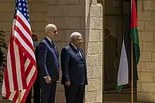 The Trump administration adopted a general stance of support for Israeli positions. On 3 May 2017, Palestinian President Abbas visited the White House for the first time during the Trump administration.[48] According to Bob Woodward, citing as his source Rex Tillerson, Trump's early support for Israel wavered: he had begun to wonder whether Netanyahu might not be the major obstacle to a peace agreement between Israel and the Palestinians. On his visit to Israel on 22 May 2017 Trump met Netanyahu and was shown by the latter tapes that appeared to show Mahmoud Abbas advocating the killing of children. Netanyahu then asked him, 'And that's the guy you want to help?'. Trump was outraged by what he saw. After their meeting ended, Rex Tillerson was called in and shown the same material, a 'crudely forged video', and told the president the clips looked like fabrications. Trump remained convinced they were authentic.[49] On the following day, at his meeting with Abbas in Bethlehem, Trump then lashed out at the Palestinian leader, calling him a liar and murderer. Woodward appears to suggest that this disinformation was behind Trump's decision to close the PLO office in Washington and cut off aid to the organization.[50][51][49] This occasion, on 23 May, was Trump's first encounter with the Palestinian Authority.[52][53]