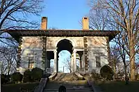 Proceeding north it runs alongside Riverview Park and the top of Holland Street[15] (a former carriage road and one of the few cobbled streets left in Hudson County) connecting to Paterson Plank Road. At 524 is the Van Vorst House a stone farmhouse built in 1742 by the family Van Vorst and considered to be the second oldest standing building in Hudson County.[16] At Congress Street the 9th Street-Congress Street Station of the Hudson Bergen Light Rail is one block to the east connected by an elevator to platforms at the base of the cliff.