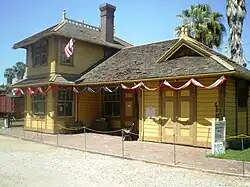 The Eastlake style Palms-Southern Pacific Railroad Depot building was situated approximately 600 yards (550 m) west of the present station, on the south side of the tracks, and remained in active rail service until the closure of the Santa Monica Air Line in 1953.