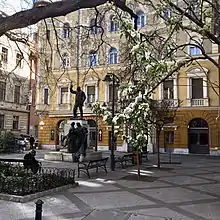 The Palace District contains important educational and cultural institutions. Between the Múzeum körút and Puskin utca is the Humanities Faculty of Budapest's Eötvös Loránd University,[16] built 1880-3 by Imre Steindl, also the architect of the Parliament building.[17] The central administration and many of the departments of the city's Semmelweis University (of medicine) occupy the block between Üllöi út, Baross utca, Mária utca and Szentkirályi utca.[18] They had appeared on maps by 1896 and are of a similar style to the nearby Eötvös Loránd University buildings. In addition, the Semmelweis University's Faculty of Health Sciences and the Hungarian Society of Therapists are housed in the former sanatorium and medicinal baths at Vas utca 17 (see photo). The Pázmány Péter Catholic University[19] occupies two buildings on Szentkirályi utca, while the German-language Andrássy University is housed in the Festetics Palace.[20] The Arts and Humanities Faculty of the Károli Gáspár University of the Reformed Church of Hungary[21] is at Reviczky utca 4 and plans to expand ts presence in the Palotanegyed, into the former Károlyi palaces between Reviczky utca and Múzeum utca once their current redevelopment has been completed.