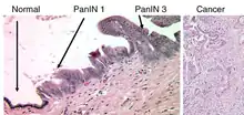 The first is pancreatic intraepithelial neoplasia (PanIN). These lesions are microscopic abnormalities in the pancreas and are often found in autopsies of people with no diagnosed cancer. These lesions may progress from low to high grade and then to a tumor. More than 90% of cases at all grades carry a faulty KRAS gene, while in grades 2 and 3, damage to three further genes – CDKN2A (p16), p53, and SMAD4 – are increasingly often found.[2]