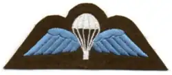 The Parachute Badge with Wings insignia, which depicts an open parachute embroidered in white flanked by a pair of wings embroidered in light blue, is only to be worn by a qualified parachutist who has subsequently been on the posted strength of a unit where they may be ordered in the course of their duties to parachute.[4] Those who do not serve with a parachute unit are permitted to wear the Parachute Badge without Wings, colloquially known as the 'Lightbulb'.[5]