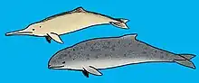 Reconstruction of Parapontoporia pacifica (top) with the fossil porpoise Piscolithax tedfordi | |