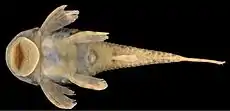 Pareiorhina species all have lateral borders of the head without developed bristles, a naked abdomen, dorsal plates meeting along the mid-dorsal line between the dorsal and caudal fins, no adipose fin, ventral plates covering the midventral line, and the dorsal portion of body behind dorsal fin flatenned (flat caudal peduncle with a rectangular cross section).[1] In P. carrancas and P. rudolphi, the teeth are simple, while in P. brachyrhyncha, the teeth have a minute lateral cusp at the base of the main cusp.[1] P. brachyrhyncha and P. carrancas are unique in lacking an adipose fin and azygous plates; in loricariids without an adipose fin, it is usually replaced by a series of azygous plates that form a ridge. However, these two species lack both the fin and the ridge.[1] These species range from about 4.1–4.5 centimetres (1.6–1.8 in) in length.