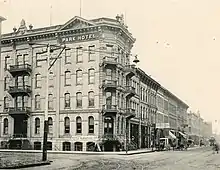 In its initial operation, the hotel was owned by Fred Michel and managed by Rush Field.[12] By May 17, 1879, the hotel was placed in receivership, though it was stated that the hotel would not close.[13] Michel arranged a banquet, later changed to a "grand military prize drill and brass band tournament", to raise funds, dispose of his real estate holdings, and adjust his and the hotel's financial matters. It was to be held on September 16-18, 1879.[14] By late October, a premature statement was made that the hotel would close, though a correction indicated the owners would make changes yet keep it open.[15] In November 1879, furniture and fixtures from the hotel were sold at auction.[16][17] In 1880, Michel proposed renting the vacant hotel at a nominal rate to the government for temporary use, and he offered to donate the park space he owned west of the hotel for a new federal courthouse.[18]