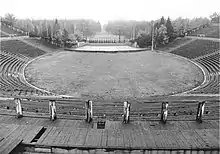 Starting around 1950, parts of Volkspark Wuhlheide were remodeled into the Ernst Thälmann Pioneer Park, following Soviet models. The large open-air stage was built for the occasion of the third World Festival of Youth and Students in the summer of 1951 (opening ceremony on 27 July 1951 under Mayor Friedrich Ebert Jr.). It was erected on mounds of rubble, on which were laid terraced, oval-shaped rows of seats for approximately 20,000 visitors. In order to reach the upper ring of the wall from the outside and to reach the seats on the inside, extensive stairway systems were created. Necessary restrooms and adjacent buildings were built behind the walls in accordance with contemporary hygiene standards and knowledge. In the following years, a multitude of cultural and political events occurred at the venue.