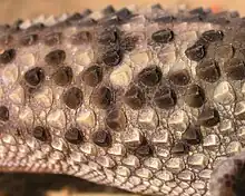 Distinctly enlarged and spiny scales are present across the body. At the midbody, there are 17 rows of tuberculate scales arranged longitudinally. The dorsal scales of the limbs are mostly keeled and tuberculate, and the digits are expanded at the tips. The ventral scales of the forelimbs are notably smaller than the ventral scales elsewhere on the body. In adults, the tail has irregular rows of spine tubercles, whereas juveniles present these tubercles in very regular rows.[4]