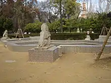 The Fountain of the Lions (Fuente de los Leones), based on a concept by the park designer Jean Claude Nicolas Forestier, was sculpted by Manuel Delgado Brackembury in 1913. It consists of four stone lions, each carrying a shield, placed on four of the eight sides of the octagonal fountain into which they spit water. The fountain is decorated with tiles from the workshop of Ramos Rejano. The lions were installed in 1928. Badly damaged by vandals, in 1957 they were replaced by copies made by the Sevillian sculptor Juan Abascal Fuentes. The fountain was restored in 1992.[4]