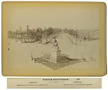 Liberal general Porfirio Díaz seized president power in 1876 after having distinguished himself as a leader in the war against the French Intervention. As president, he fully supported the embellishment of the Paseo de la Reforma with statuary representing Mexico's heroes through its history, creating "monuments worth of the culture of this city, and whose sights remind of the heroism with which the nation fought against the Conquest in the sixteenth century and for the Independence and Reform in the present."[7] Initially, liberal General Vicente Riva Palacio, grandson of liberal leader of independence Vicente Guerrero, was involved in projects to raise the capital's profile when he served as Díaz's Minister of Development (fomento) (1876-1879). As part of the centralizing impetus of Díaz's government, the Paseo de la Reforma was to include statues of heroes and cultural eminences of Mexico's constituent states, although some state leaders objected to the reassertion of traditional Mexico City's power.[8]