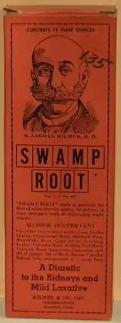 Native American themes were also useful: natives, imagined to be noble savages, were thought to be in tune with nature, and heirs to a body of traditional lore about herbal remedies and natural cures. One example of this approach from the period was Kickapoo Indian Sagwa, a product of the Kickapoo Indian Medicine Company of Connecticut (completely unrelated to the real Kickapoo Indian tribe of Oklahoma), supposedly based on a Native American recipe.[17] This nostrum was the inspiration for Al Capp's "Kickapoo Joy Juice," featured in the comic strip, "Li'l Abner". Another benefit of claiming traditional native origins was that it was nearly impossible to disprove. A good example of this is the story behind Dr. Morse's Indian Root Pills, which was the mainstay of the Comstock patent medicine business. According to text on a wrapper on every box of pills, Dr. Morse was a trained medical doctor who enriched his education by travelling extensively throughout Asia, Africa, and Europe. He supposedly lived among the American Indians for three years, during which time he discovered the healing properties of various plants and roots that he eventually combined into Dr. Morse's Indian Root Pills. No one knows if Dr. Morse ever actually existed.