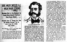 When journalists and physicians began focusing on the narcotic contents of the patent medicines, some of their makers began replacing the opium tincture laudanum with acetanilide, a particularly toxic non-steroidal anti-inflammatory drug with analgesic as well as antipyretic properties that had been introduced into medical practice under the name Antifebrin by A. Cahn and P. Hepp in 1886.[19] But this ingredient change probably killed more of the nostrum's users than the original narcotics did, since acetanilide not only alarmingly caused cyanosis due to methemoglobinemia, but was later discovered to cause liver and kidney damage.[20]