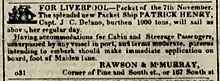 By 1843 four lines of packets were advertising sailings on eighteen different ships between Liverpool and New York, every month, on the 1st, 7th, 13th, 19th and 25th. The Patrick Henry, Capt. Delano, was the first advertised.[15]
