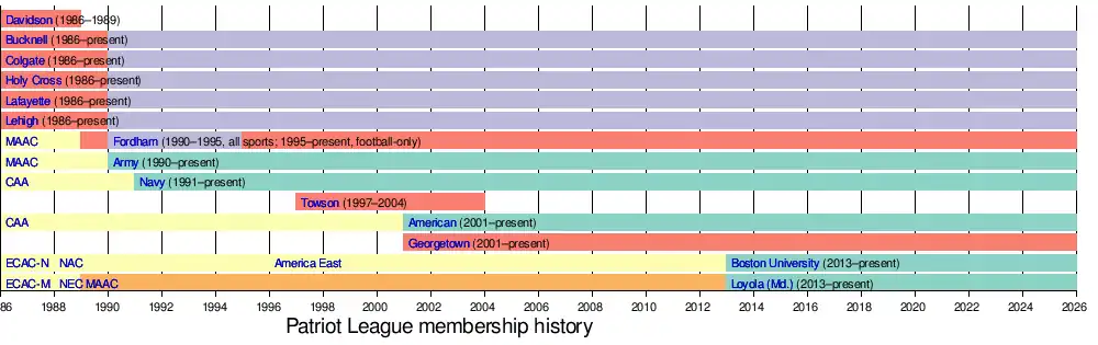 In 1995, Fordham resigned its full membership (leaving the league with seven full members) but continued as an associate member in football. In 1996, Fairfield and Ursinus joined as associate members in field hockey.[5] (Fairfield left after the 2003 fall season and is now an associate member of the Northeast Conference. Ursinus left after the 2001 fall season and is now a full member of the Division III Centennial Conference.[7]) In 1997, Towson joined as an associate member in football. (Towson left after the 2003 fall season to join the Atlantic 10 Conference, whose football conference would be absorbed by the Colonial Athletic Association in 2007.) In 1999, Hobart joined as an associate member in men's lacrosse and Villanova joined as an associate member in women's lacrosse. (Hobart left after the 2004 spring season, to join the ECAC Lacrosse League, while Villanova left after the 2006 spring season.) In 2001, American University joined as the eighth full member and Georgetown University joined as an associate member in football.[5] Two schools announced in summer 2012 that they would join the league for the 2013–14 academic year, with Boston University making its announcement on June 15,[8] and Loyola University Maryland doing so on August 29.[9]