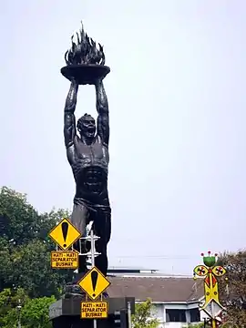 Patung Pemuda Membangun is a 25-meter Soviet-style dark-grey terrazzo statue which stands on a roundabout at the south end of Jalan Jenderal Sudirman. The roundabout marks the entrance to the Kebayoran Baru subdistrict in South Jakarta. The statue was erected to inspire people to participate in the nation's building, especially the youths of the new nation. The name Pemuda Membangun ("Youth Advancement") was chosen to inspire young people. The design of the statue shows a near naked young man shouting while holding a plate containing a flame above his head, his sinews and muscles strain at full effort. The flaming plate symbolizes youth taking forth light into the future.[2]