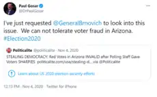 Several weeks after the 2020 presidential election, Gosar was one of 27 Republican members of Congress to request that U.S. Attorney General William Barr "appoint a Special Counsel to investigate irregularities in the 2020 election."[95] The Arizona Republican Party produced a video, featuring Gosar and Representative Andy Biggs, falsely claiming that there was widespread voter fraud in the election. Gosar falsely claimed that Arizona's voting machines were faulty, that Wisconsin intentionally paused counting votes to "dump" 100,000 votes into the count for Joe Biden, and that dead people voted in Pennsylvania. He and Biggs also demanded an audit of Maricopa County's vote count.[96] Gosar strongly objected to counting electoral votes for Biden from certain states.