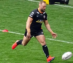 McShane was ever-present for Castleford in the 2016 season, appearing in every game.[7] He was an integral part of the 2017 squad that won the League Leaders' Shield and he played in the 2017 Super League Grand Final defeat by Leeds at Old Trafford.[15][16][17] He was named Castleford Tigers' 3rd Place 2017 Player of the Year.[18]