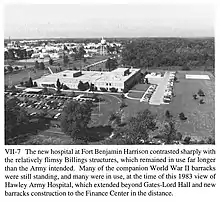 The US Army Medical Department Activity at Fort Benjamin Harrison, Indiana, was named the Hawley Army Community Hospital when it opened on May 12, 1973. On October 1, 1977, the hospital was reorganized as the Hawley U.S. Army Health Clinic, a subordinate clinic of the Fort Knox MEDDAC, during force reductions in the post-Vietnam era. On October 1, 1982, Hawley Army Health Clinic was again reorganized and redesignated as Hawley U.S. Army Community Hospital during the Reagan-era military build-up. On October 1, 1993, the hospital was once more reorganized and redesignated as the Hawley U.S. Army Health Clinic as part of Fort Benjamin Harrison's Base Realignment and Closure (BRAC), and on September 30, 1995, the Hawley U.S. Army Health Clinic closed.[36][37] The hospital was demolished in 2006 to make room for a new Post Exchange/Commissary complex, replacing facilities that had remained open after the BRAC closure of the fort.[38]