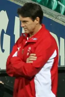 Returning to Australia and the Sydney Swans, Roos then became an assistant coach under senior coach Rodney Eade in 2001.[14] Part-way through the 2002 season, with the Swans' record becoming worse by the week, Eade resigned. The club administration started the search for a new coach and it is widely believed that negotiations with Terry Wallace were at an advanced stage. Nevertheless, when Eade finally went with several games of the minor round still to be played, Roos was appointed caretaker senior coach for the remainder of the 2002 season, a move hugely popular with Swans fans, who remembered his great contribution to the club as a player.[15][16][17]
