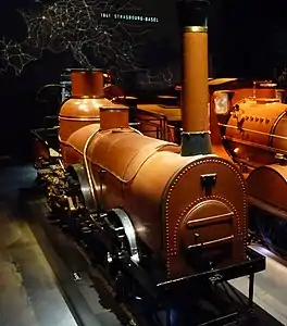 The "Pays de Waes" is the second locomotive in a series of nine machines designed by the Belgian engineer Gustave De Ridder. Built in his private workshops, the locomotive was put into service on a narrow gauge line (Anvers-Saint-Nicolas-Lokeren-Gand) that was operated by the Compagnie du chemin de fer d'Anvers à Gand par Saint-Nicolas et Lokeren (a private company) in 1845,[2] a narrow gauge line ( 1,145 mm (3 ft 9+3⁄32 in) vs 1,435 mm / 4 ft 8+1⁄2 in).[1] The locomotive reached a speed of 60 km/h (37 mph) in 1844, the year of its construction. [3]