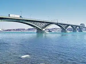 The Peace Bridge is one of the busiest on the Canada–United States border, with over one million trucks crossing it each year and delays of up to almost four hours.[5] Other nearby bridges between the United States and Canada include the Rainbow Bridge, the Queenston-Lewiston Bridge and the Whirlpool Rapids Bridge. The Queenston-Lewiston Bridge and the Peace Bridge are the only Niagara River crossings that allow heavy trucks.