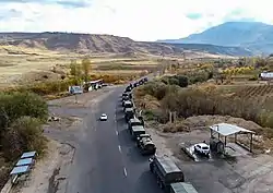 Since 12 December 2022, citizens of Azerbaijan claiming to be "eco-activists" started protests on the Lachin corridor,[81] thus effectively blocking the only road connecting Artsakh to the outside world and to Armenia[82] in violation of the trilateral ceasefire agreement of 9 November 2020. Although the Azerbaijanis claim to have peaceful intentions, their blockade is causing severe consequences for the population; importation of food, fuel, and medicine is blocked, and the 120,000 residents of the region are trapped, creating a humanitarian crisis.[83] Despite statements from the Russian side, assuring of Russian peacekeepers' efforts to reinstate free movement on the corridor[84][85] the road has remained blocked, which has drawn international criticism toward the mission.[86][87]