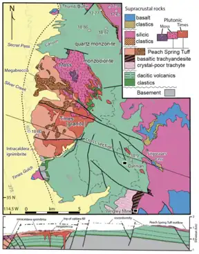 The 32,000 km2 area containing the Peach Spring Tuff overlies multiple tectonic environments including a stable plateau, a normal faulting transition zone, a basin and region, the Colorado River Extensional Corridor, and a strike slip region.[3] There is evidence that prior to the eruption that resulted in the Peach Spring Tuff there was uplift of the Colorado Plateau that exposed erosional surfaces underlying the Peach Spring Tuff and provided drainage slopes that impacted the direction of eruptive flow.[4]