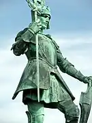 The memorial features a 2.1 m (6 ft 11 in) high bronze statue by George Frampton depicting Saint George in medieval armour, standing on a slain dragon. Saint George is raising the hilt of his sword in his left hand to form a cross, encircled by a wreath, and resting his left hand on a shield which bears Saint George's Cross. The cast bears the name and date "GEO. FRAMPTON RA / 1919".