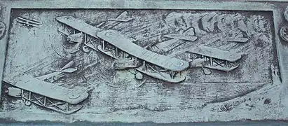 The statue stands on a square granite plinth, mounted on three granite steps. Each side of the plinth bears a bronze plaque which together list the names of the 445 staff of the Pearl Assurance Company that were killed in action in the First World War, and an inscription "THEY PASSED AWAY IN THE DAYS / OF THEIR STRENGTH, THEY / LIVE FOREVER IN THE UNDYING / FACT OF THEIR SACRIFICE". Just above each plaque is a small rectangular decorative bronze plaque: two in low relief showing warships (west) or aircraft (east), and two in high relief (north and south) showing with a helmet surrounded by a wreath.
