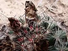 The body of this succulent plant is one or more enlarged rounded stems, 2.5–15 centimeters wide and 2.5–25 centimeters tall, though it usually is less than 15 centimeters in height. The shape of this stem is like an egg with the wider part towards the soil (ovoid) or like a ball shape (globose), but can be flattened out or sunken into the ground in appearance (depressed), particularly in winter.[3][4] The surface of the plant is covered in pyramid shaped projections or branch-lets called tubercles.[5][6] At the tip of each tubercle a round to oval structure 3 millimeters across called an areole.[3][6] It is covered in fine hairs (villous) and is where the cluster of spines grow. The spines are quite hard and smooth and vary in color and size by position.[3] The spines at the center of the cluster number 4 to 11, are 5–21 millimeters long, and are a dark color such as reddish-brown or even black at the ends with a cream to yellow colored base.[3] The spines arrayed around the center (radial) number 12 to 35 per cluster, are 3–13 millimeters long, and are white in color.[3][6]