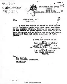 - ↑ Pedra Branca case, para. 223. See also "1953 Johor letter 'hands' over to Singapore", New Straits Times (reproduced on AsiaOne), 24 May 2008, archived from the original on 20 May 2016.