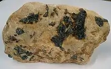 Most pegmatites have a simple composition, often being composed entirely of minerals common in granite, such as feldspar, mica, and quartz.[3] The feldspar and quartz often show graphic texture.[5] Rarely, pegmatites are extremely enriched in incompatible elements, such as lithium, caesium, beryllium, tin, niobium, zirconium, uranium, thorium, boron, phosphorus, and fluorine. These complex pegmatites contain unusual minerals of these elements, such as beryl, spodumene,[8] lepidolite, amblygonite, topaz, apatite, fluorite, tourmaline, triphylite, columbite, monazite, and molybdenite. Some of these can be important ore minerals.[5] Some gemstones, such as emerald, are found almost exclusively in pegmatites.[8]