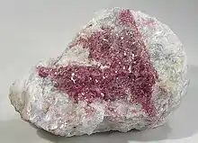 Pegmatites are the primary source of lithium either as spodumene, lithiophyllite or usually from lepidolite.[25] The primary source for caesium is pollucite, a mineral from a zoned pegmatite.[26] The majority of the world's beryllium is sourced from non-gem quality beryl within pegmatite.[27] Tantalum, niobium, and rare-earth elements are sourced from a few pegmatites worldwide, such as the Greenbushes Pegmatite,[28] the Kibara Belt of Rwanda and Democratic Republic of the Congo, the Kenticha mine of Ethiopia the Alto Ligonha Province of Mozambique,[29] and the Mibra (Volta) mine of Minas Gerais, Brazil.[30]