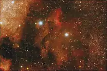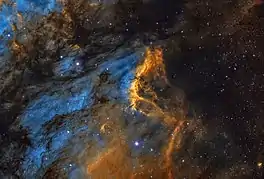 The Pelican Nebula (also known as IC 5070 and IC 5067[1]) is an H II region associated with the North America Nebula in the constellation Cygnus. The gaseous contortions of this emission nebula bear a resemblance to a pelican, giving rise to its name.[1] The Pelican Nebula is located nearby first magnitude star Deneb, and is divided from its more prominent neighbour, the North America Nebula, by a foreground molecular cloud filled with dark dust.[2] Both are part of the larger H II region of Westerhout 40.[2]
