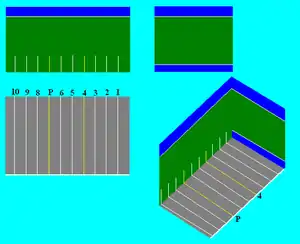 Basque pelota fronton diagram. Clockwise from top left: side wall; front wall; perspective view; ground.
