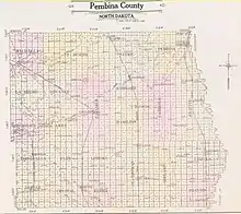 The Dakota Territory legislature created Pembina County on January 9, 1867, from previously unorganized territory. Its government was organized on August 12 of that same year. It was named for a Chippewa term for stab or stabbing.[4] Pembina, the oldest European-American settlement in the future state, was the county seat. In 1911 the seat was relocated to Cavalier.[5][6]